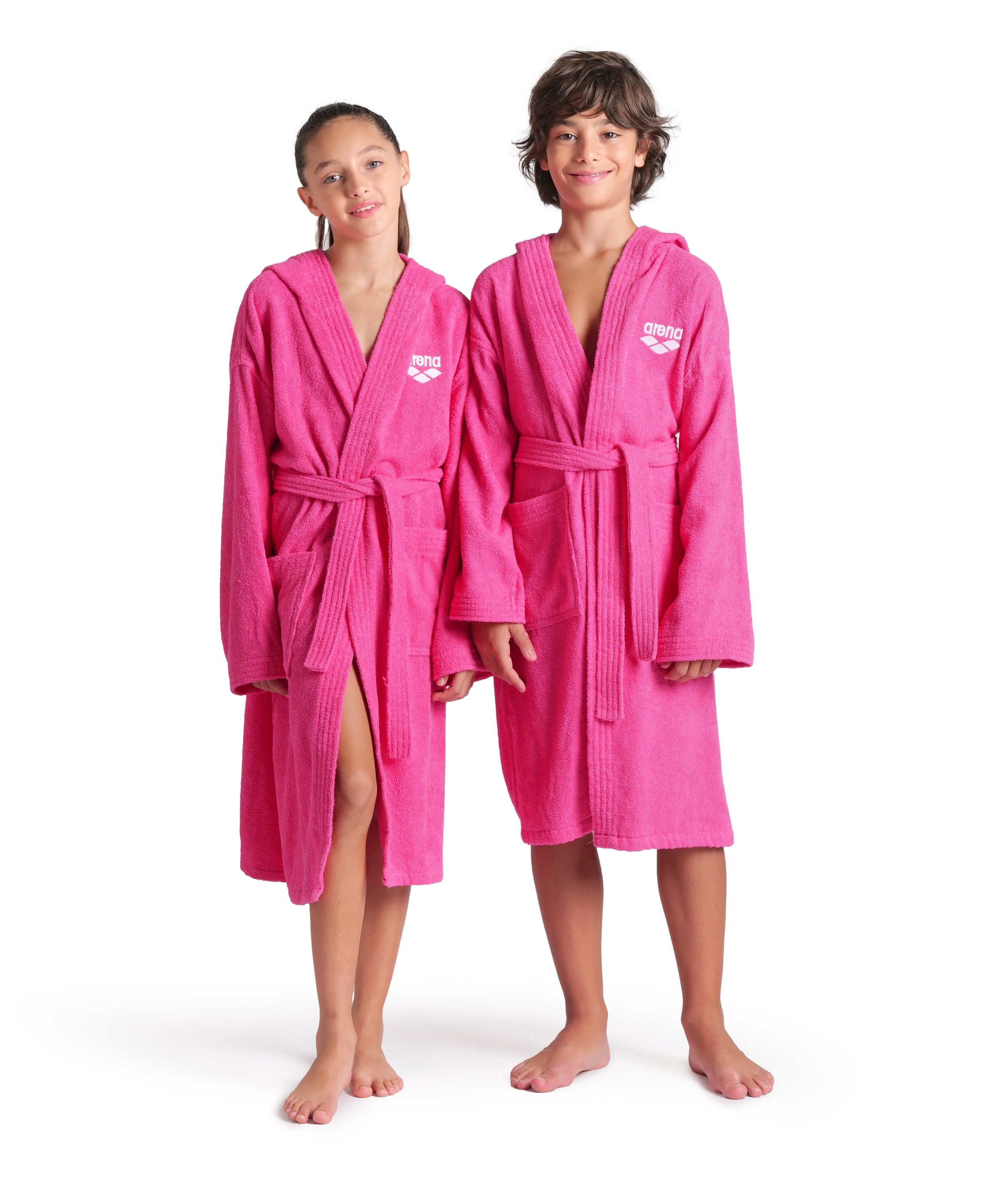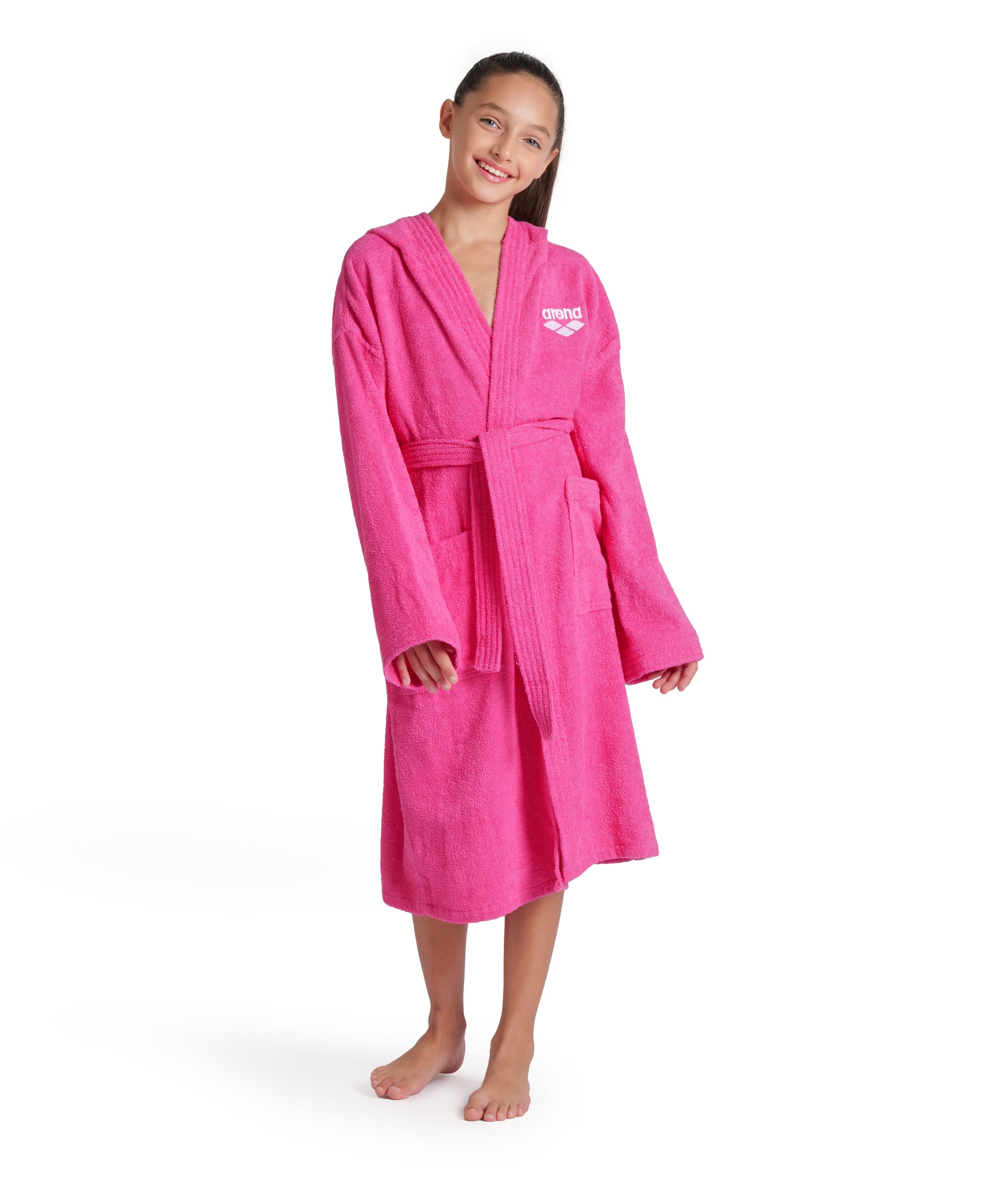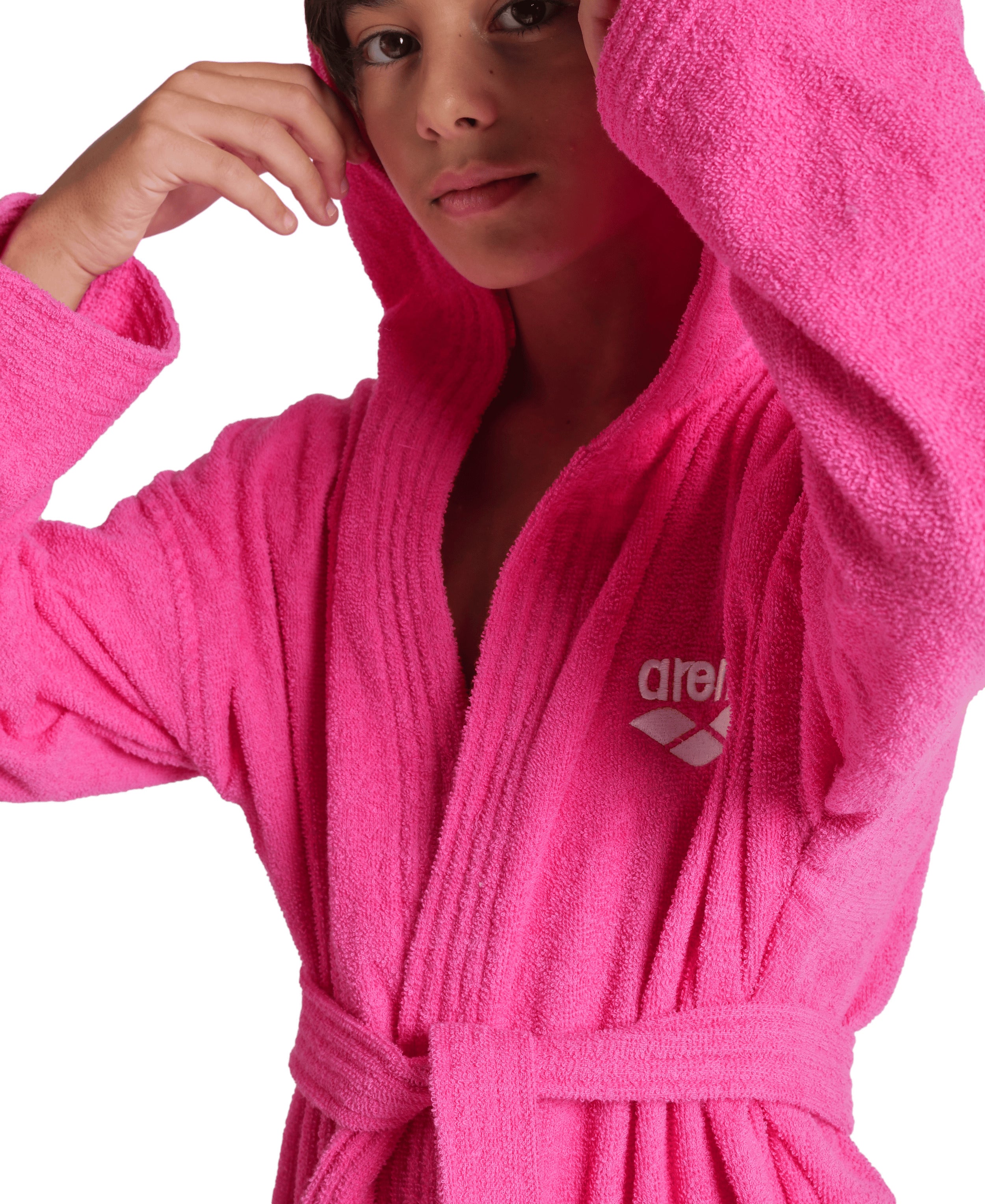 Accappatoio Arena Zeppelin realizzato in morbido cotone, perfetto per tutte le attività sportive. Modello da bambino e bambina, realizzato con doppie tasche, ampio cappuccio, maniche e cintura. Scritta Arena sul petto.